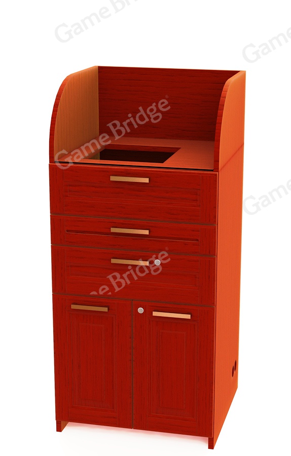 Дерев'яні вироби покривають фарбою та додатково розкривають лаком. Подібна обробка дає можливість тривалого та інтенсивного використання пристроїв без втрати зовнішньої привабливості. Верхівка шафи оснащена стінками, що служать для забезпечення прихованої роботи менеджера (поза досяжністю сторонніх осіб). У стільниці передбачено віконце для роботи з дисплеями. На верхній полиці, що висувається, зручно розміщується екран і супутні аксесуари. Середній ящик також висовується, призначений під клавіатуру та розкладку карток. Нижня полиця закривається під замок, орієнтована зберігання предметів.